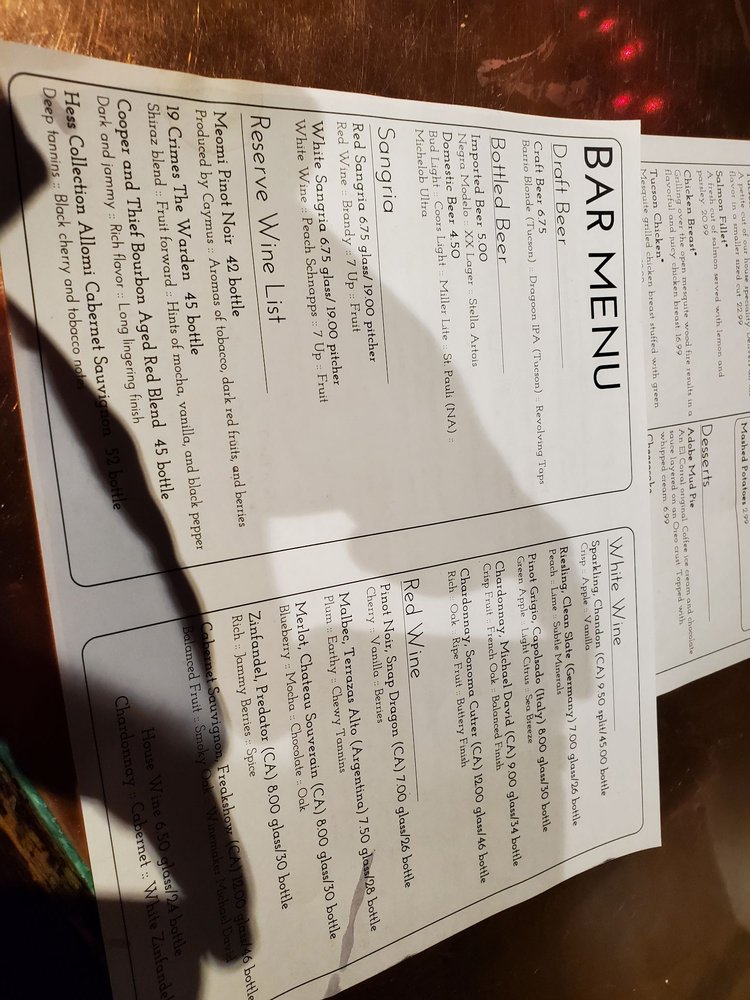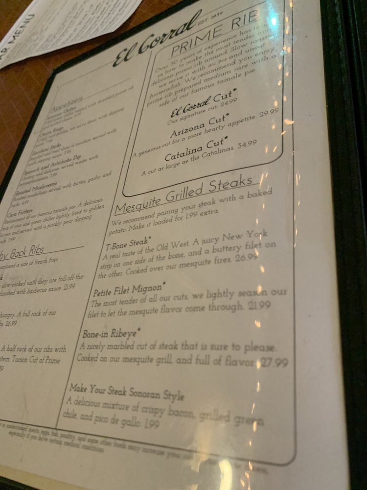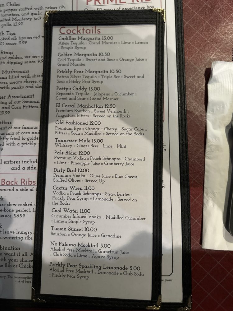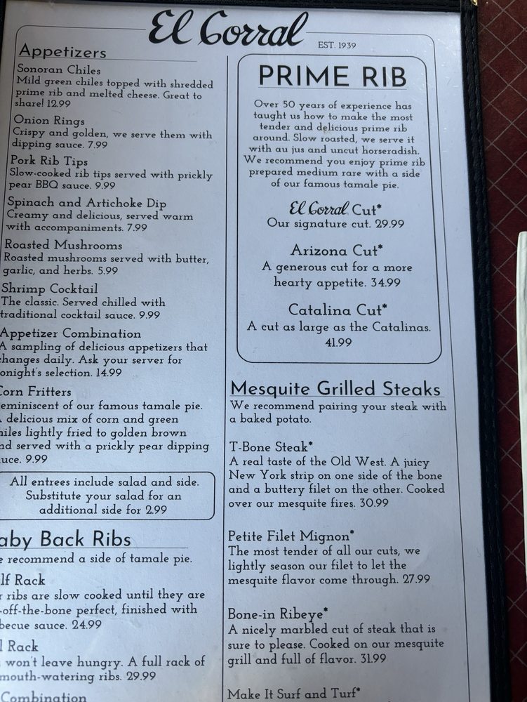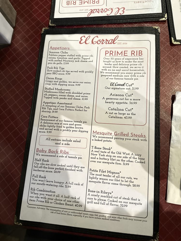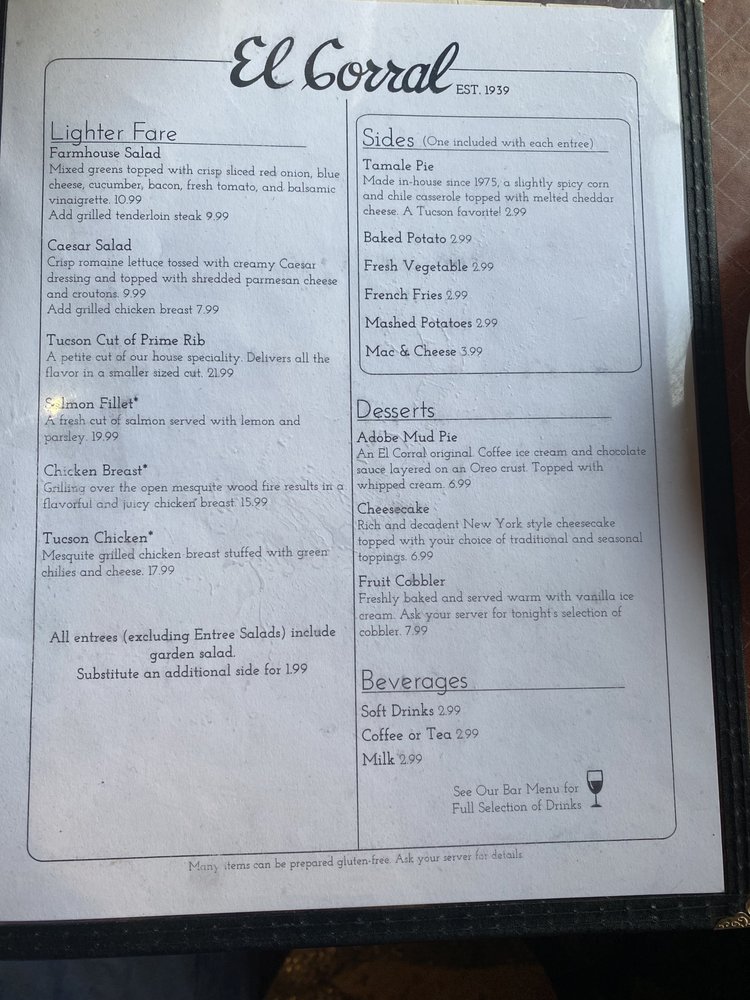 Welcome to El Corral, Tucson's cherished steakhouse, where the essence of the Old West comes alive. Nestled at 2201 E River Rd, this vibrant eatery offers a casual yet lively atmosphere perfect for families and friends alike. The menu shines with mesquite-grilled steaks, each cut crafted to perfection. From the robust T-Bone steak to the tender Petite Filet Mignon, the flavors are truly unforgettable. Vegetarian options and classic entrees, like a refreshing Salmon Fillet and zesty BBQ Chicken Salad, ensure there's something for everyone.